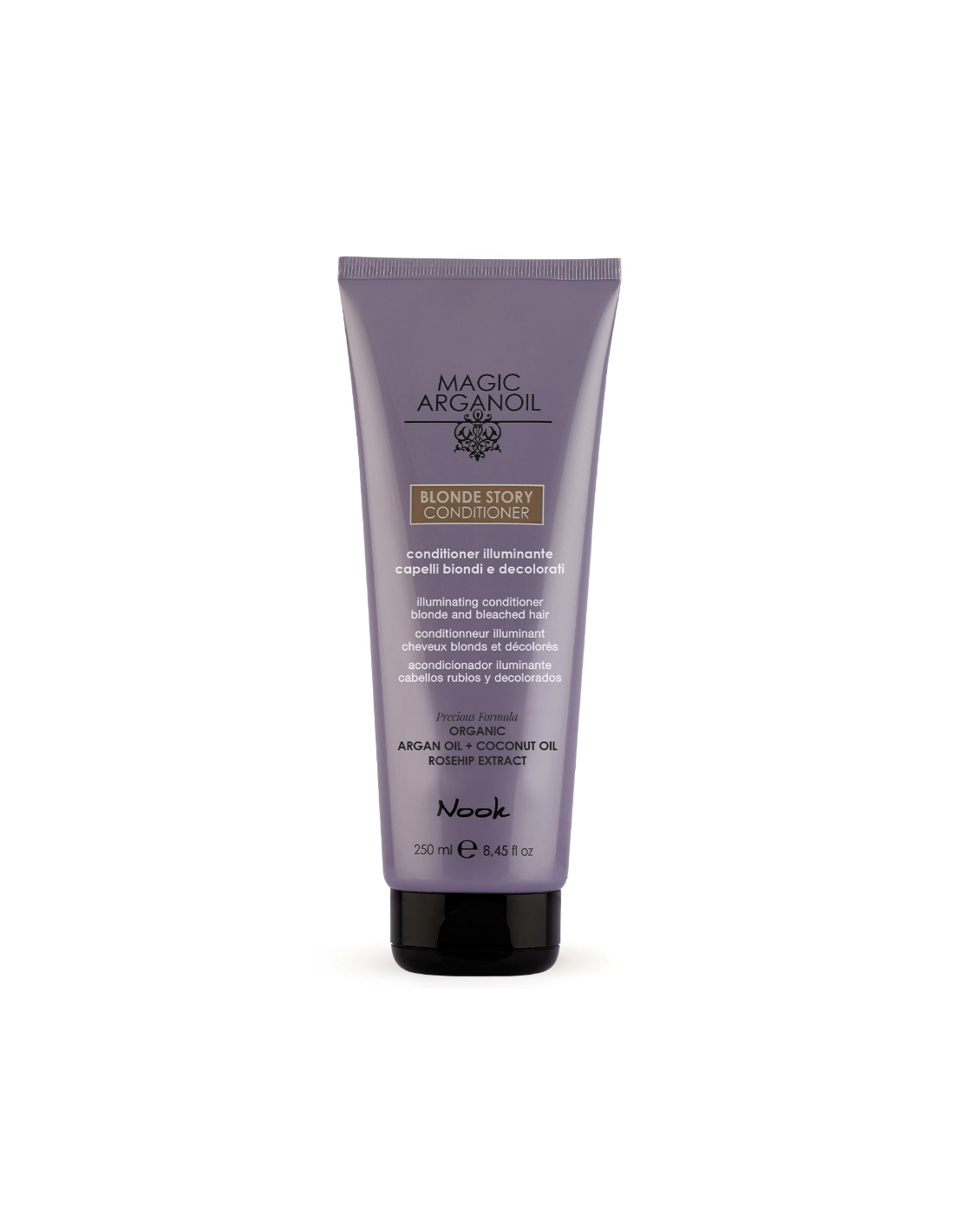 Il Blonde Story Conditioner della linea Magic Arganoil di Nook è il trattamento ideale per i capelli biondi, decolorati o con mèches. Grazie alla sua formula arricchita con Olio di Argan Biologico, Olio di Cocco e Estratto di Rosa Canina, nutre in profondità, illumina la chioma e contrasta l'effetto spento e opaco tipico dei capelli trattati.