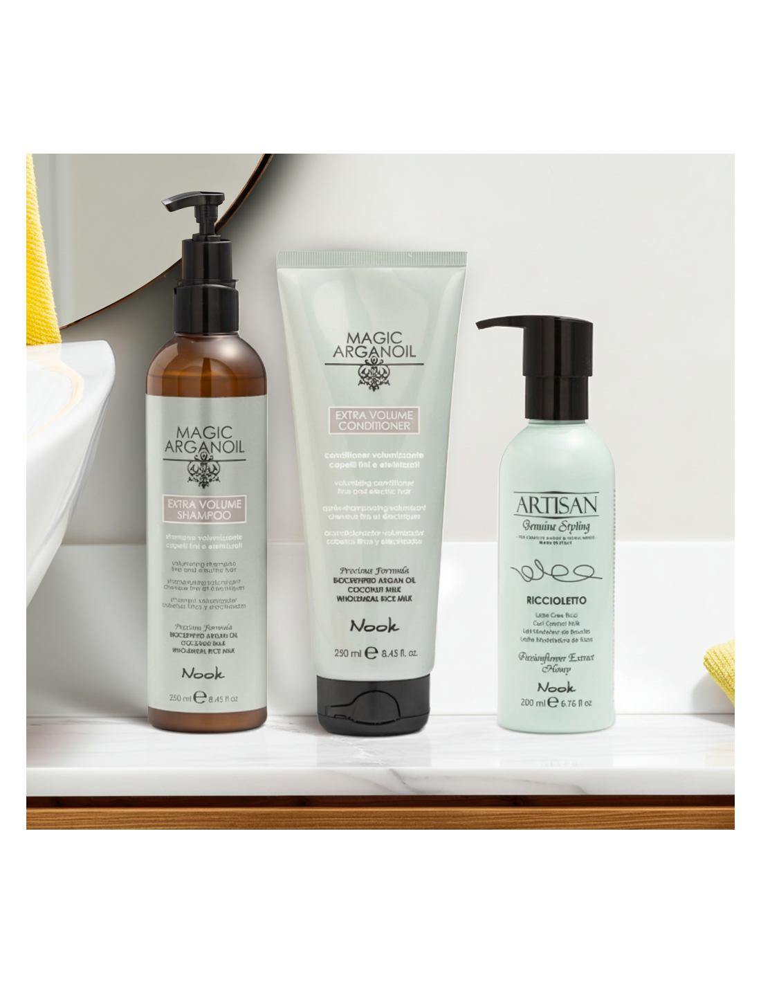Il Trio Extra Volume + Riccioletto unisce il potere volumizzante della linea Magic Arganoil con la definizione delicata di Artisan Riccioletto. Una routine pensata per capelli fini, piatti o che tendono a perdere forma, offrendo leggerezza, corpo naturale e ricci/onde ben definiti senza appesantire. Le formule sono arricchite con Olio di Argan Biocertificato, Latte di Cocco e Riso Integrale, per capelli più pieni, idratati e vitali.