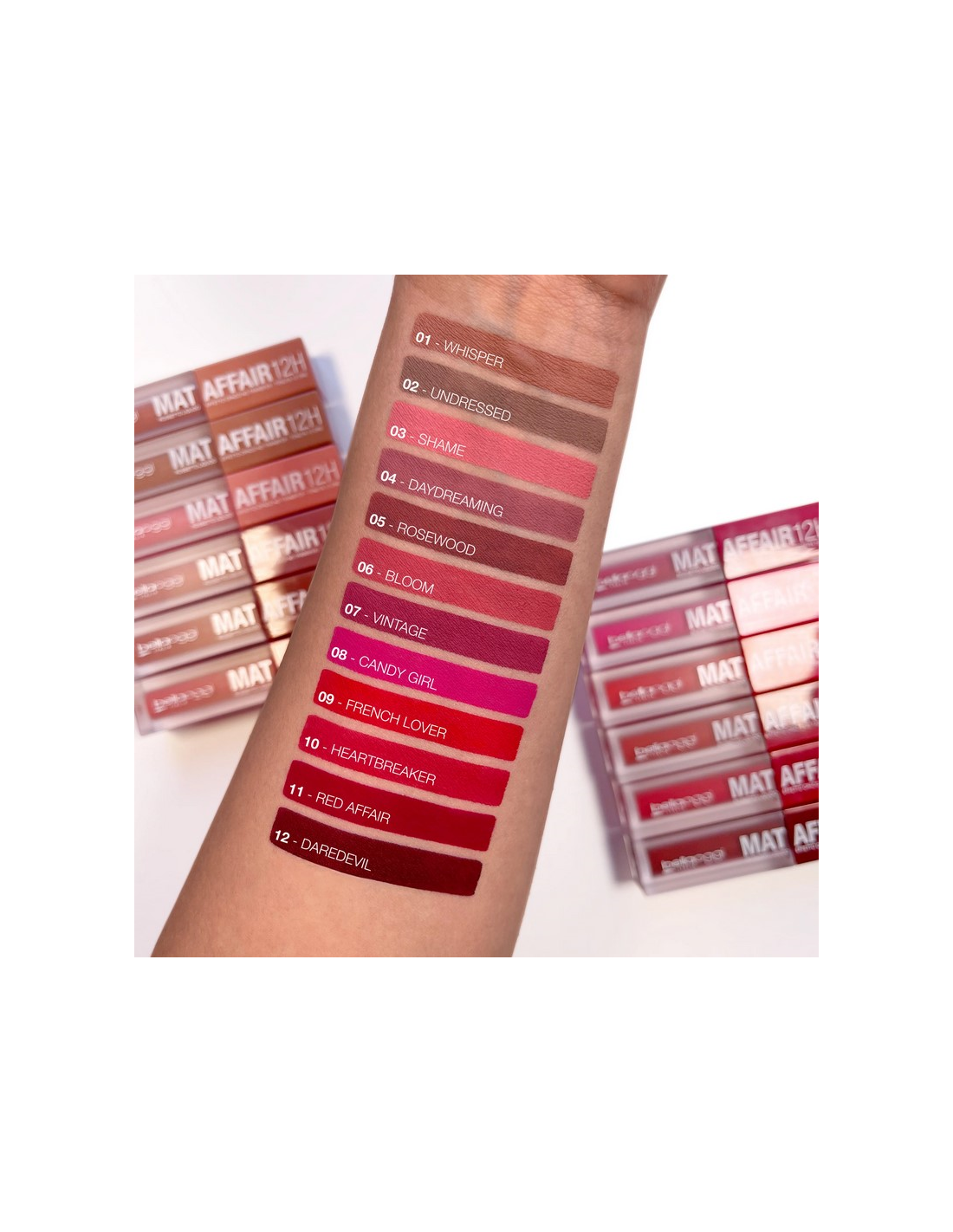 Per ogni donna è innegabile che il trucco delle labbra sia un vero punto di forza del make up viso. Sarebbe un sogno poterlo avere per tutto il giorno perfetto e senza sbavature, specilamente se devi particapre ad un occasione speciale come una cena o un evento importante. Nel corso degli anni, la ricerca delle massime performance è sempre costante, proprio per venire incontro a tutte le esigenze delle clienti. Il nuovo rossetto liquido mat affair è stato formulato per avere una durata di almeno 12 ore. La fantastica texture avvolge le tue labbra donandoti una piacevole sensazione di comfort, grazie alla presenza di olio di neem, sesamo e incenso che lasciano le labbra morbide e vellutate. Avrai un ampia scelta di 12 colori da poter utilizzare in ogni occasione.