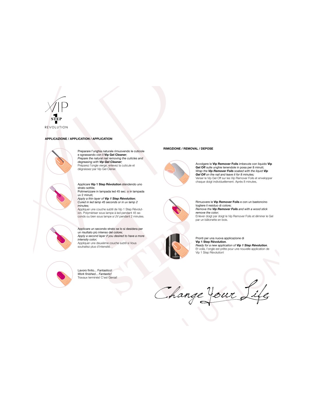 - Applicare Vip 1 Step Révolution stendendo uno strato sottile; Polimerizzare in lampada led 45 sec. o in lampada uv 2 minuti;