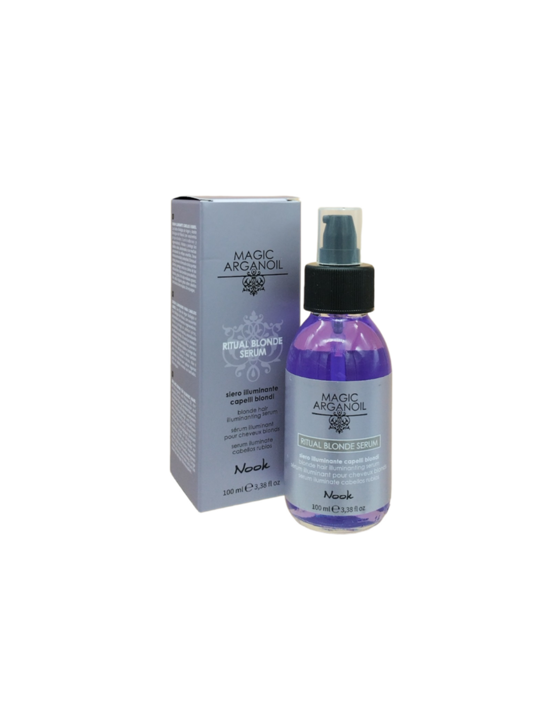 Il Ritual Blonde Serum di Nook Magic Arganoil è un trattamento illuminante e protettivo pensato per i capelli biondi, decolorati o con meches. La sua texture leggera e setosa aiuta a disciplinare i capelli, contrastando l’effetto crespo e la disidratazione. Protegge la chioma dagli agenti esterni e prolunga la luminosità del biondo, donando un aspetto sano e radioso.