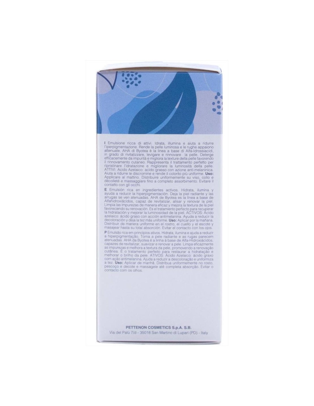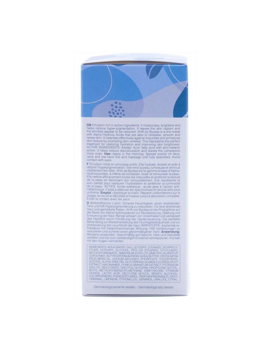 L'avanzare dell'età, l'eccessiva esposizione al sole e gli sbalzi ormonali generano uno squilibrio della comunicazione delle cellule cutanee che progressivamente alterano la produzione della melanina, provocando l'insorgere di antiestetiche macchie che rendono il colorito disomogeneo. AHA di Byotea è la linea, a base di alfa idrossiacidi, in grado di rivitalizzare, levigare e rinnovare la pelle. Deterge efficacemente dalle impurità e migliora la texture della pelle. Rappresenta il trattamento perfetto per ripristinare l'idratazione e migliorare la luminosità della pelle.